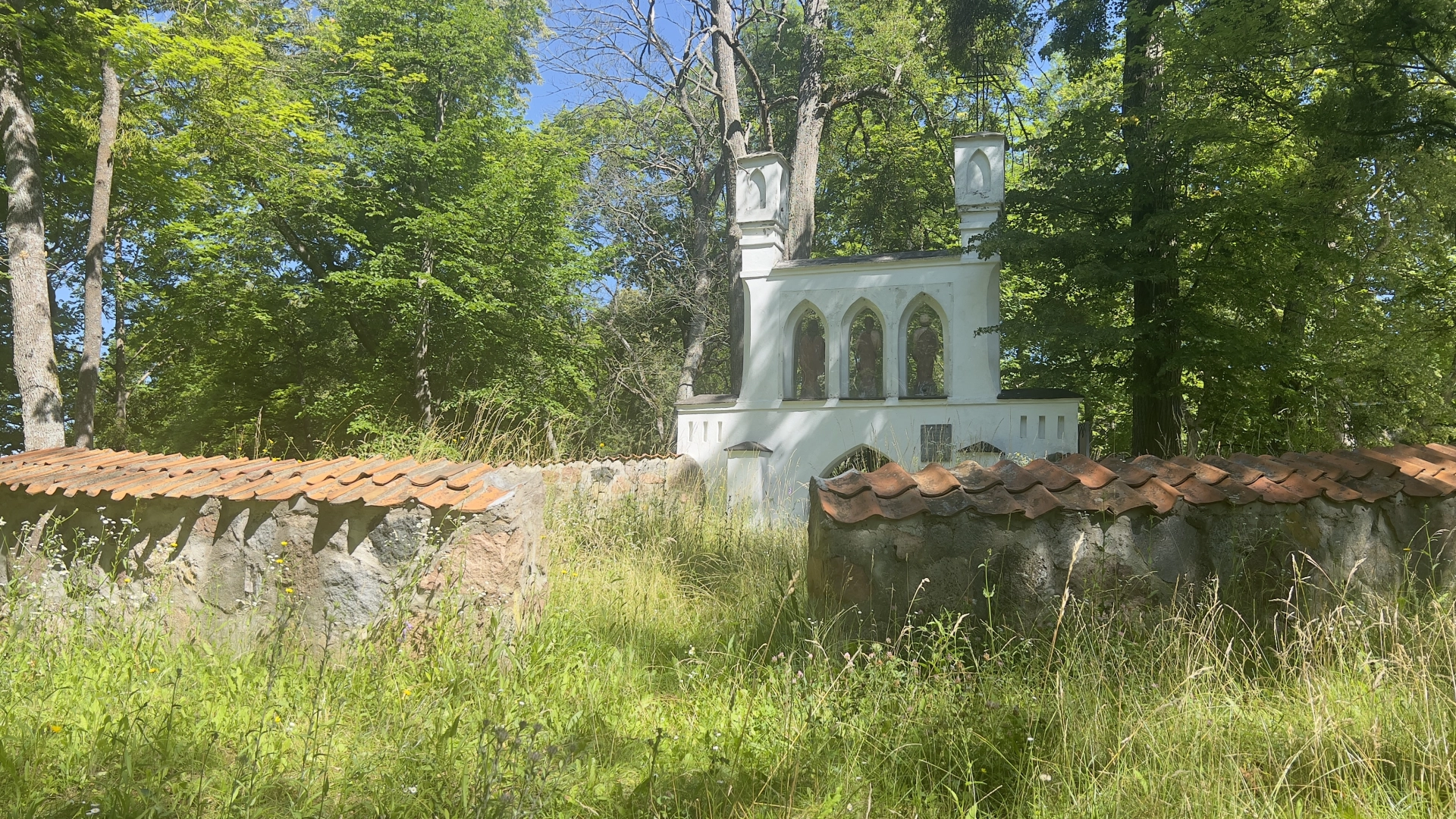 Wygląda to niezwykle tajemniczo. Na drzwiach budowli możemy zobaczyć pozostałości po płaskorzeźbach: trupiej czaszce i śmierci.