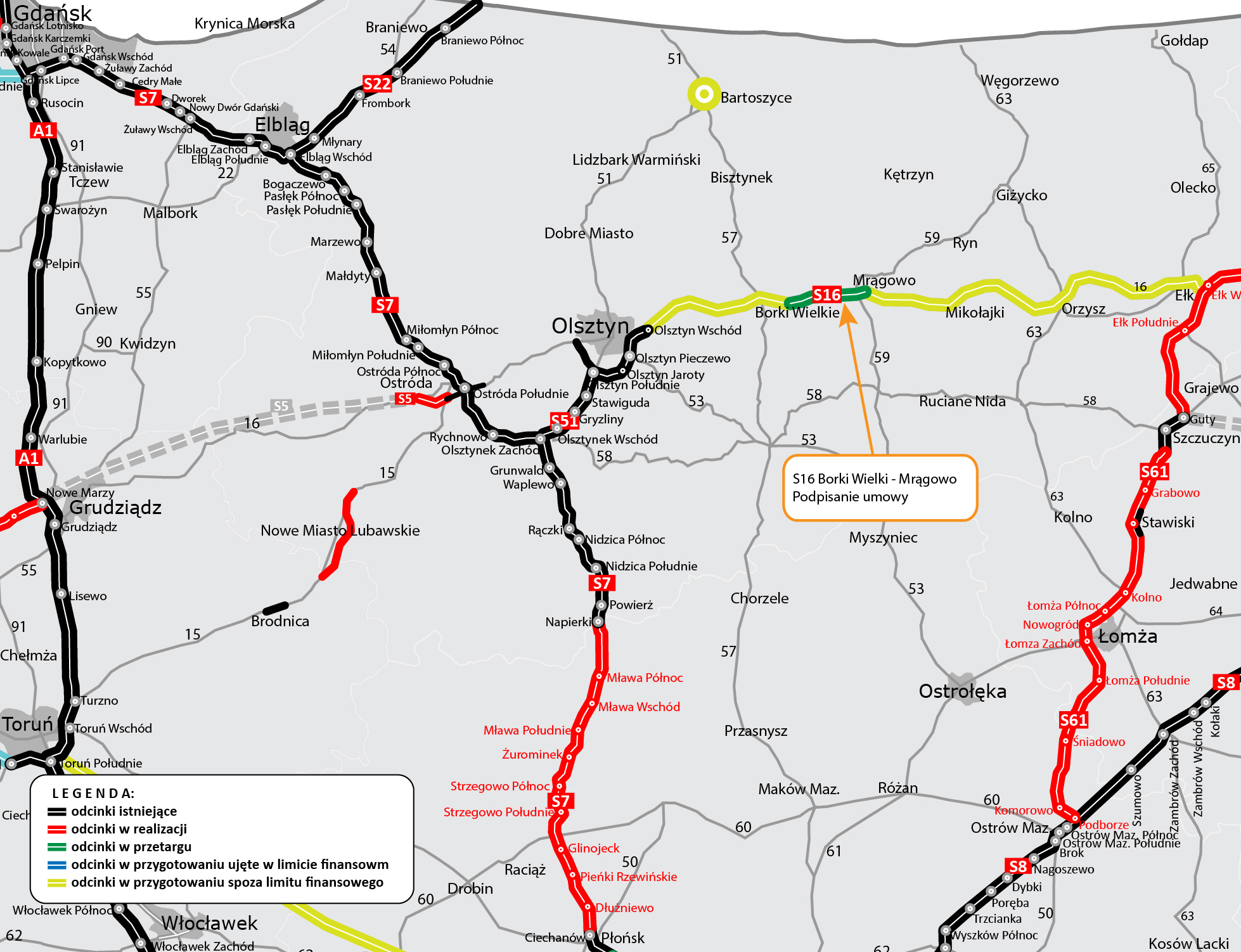 "Podpisaliśmy umowę z wykonawcą w ponownym przetargu na projekt i budowę drogi ekspresowej S16 Borki Wielkie - Mrągowo. Zadanie w terminie 36 miesięcy zrealizuje firma PORR S.A. za kwotę 625 887 983,37 zł" - informuje GDDKiA w Olsztynie.