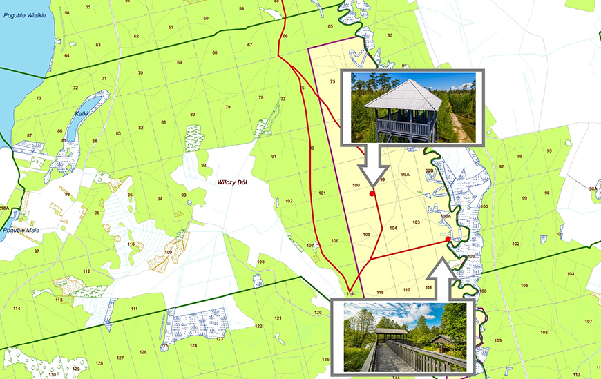 W celu ułatwienia obserwacji procesów przyrodniczych, jakie tam zachodzą, wybudowano drewnianą wieżę widokową oraz wysoki pomost - galerię nad Pisą.