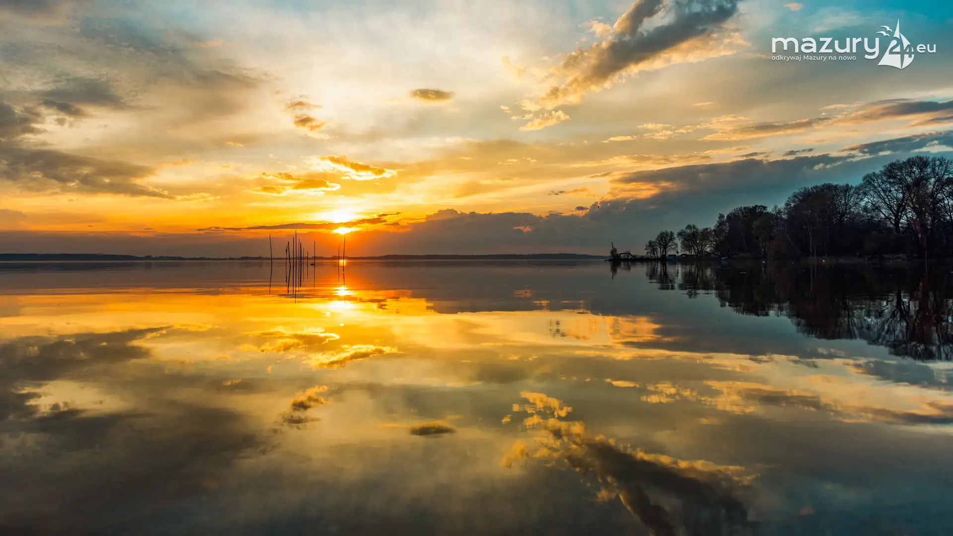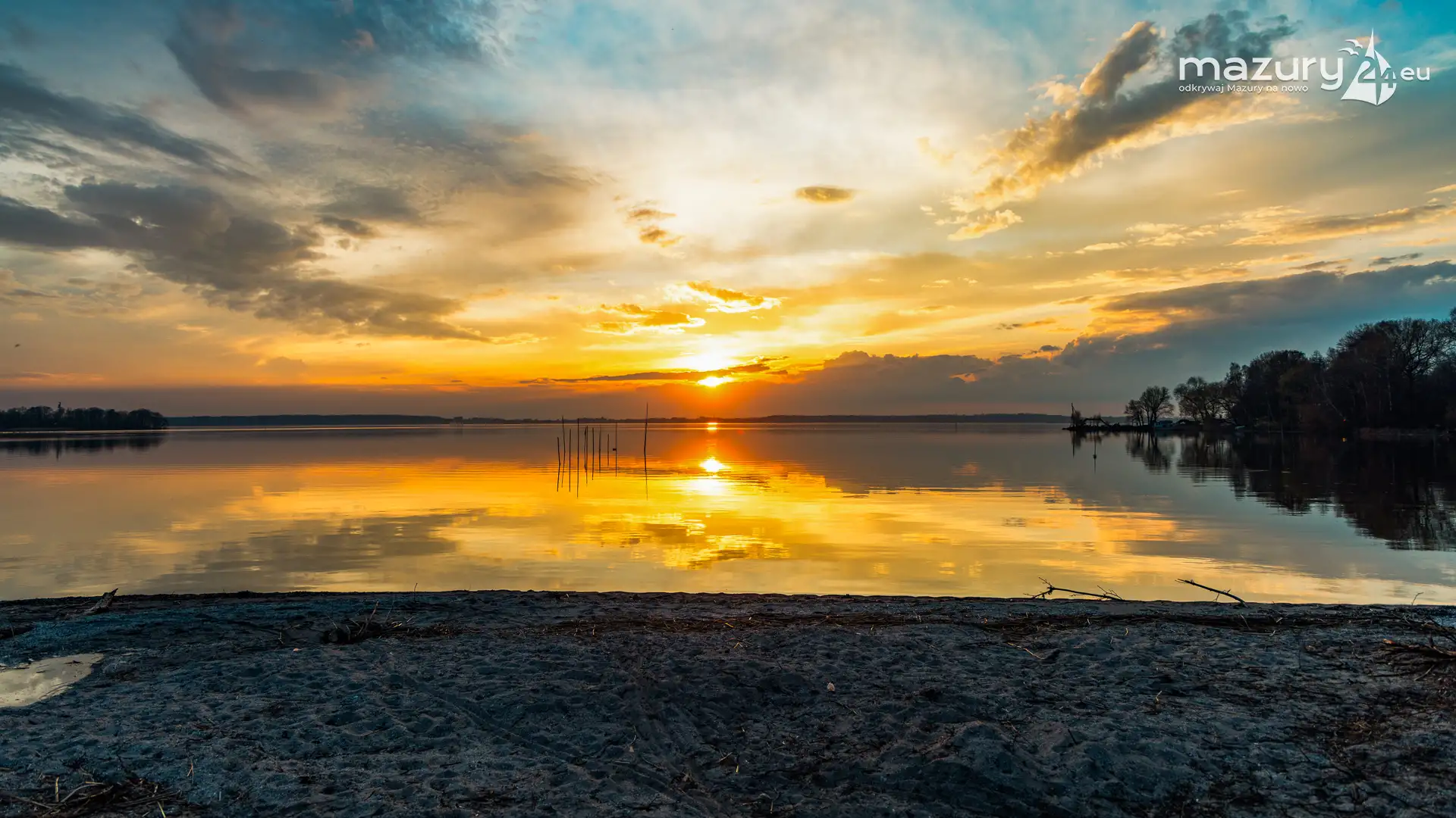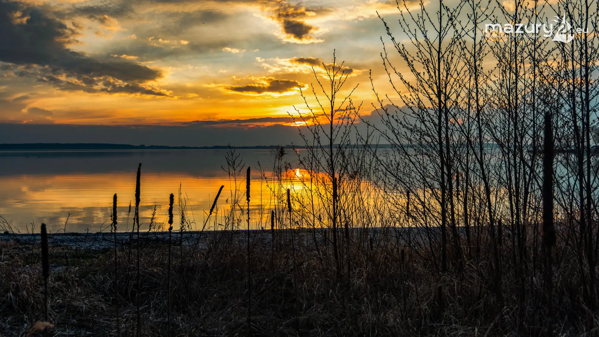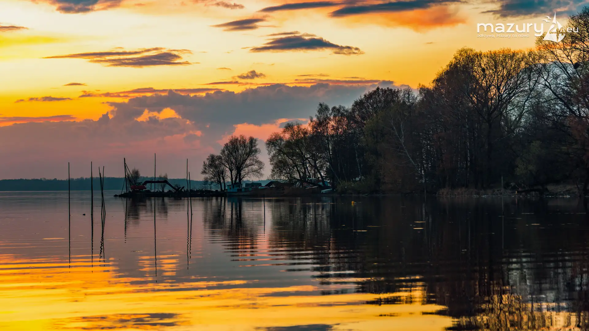 Relaksujący, kwietniowy zachód słońca nad jeziorem Dargin