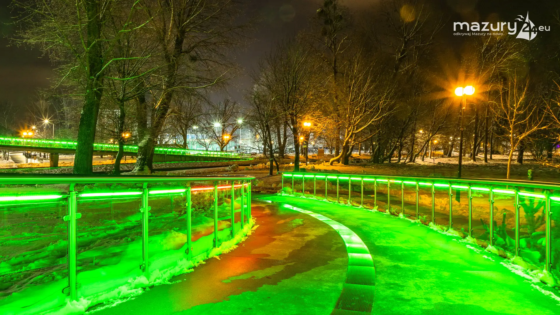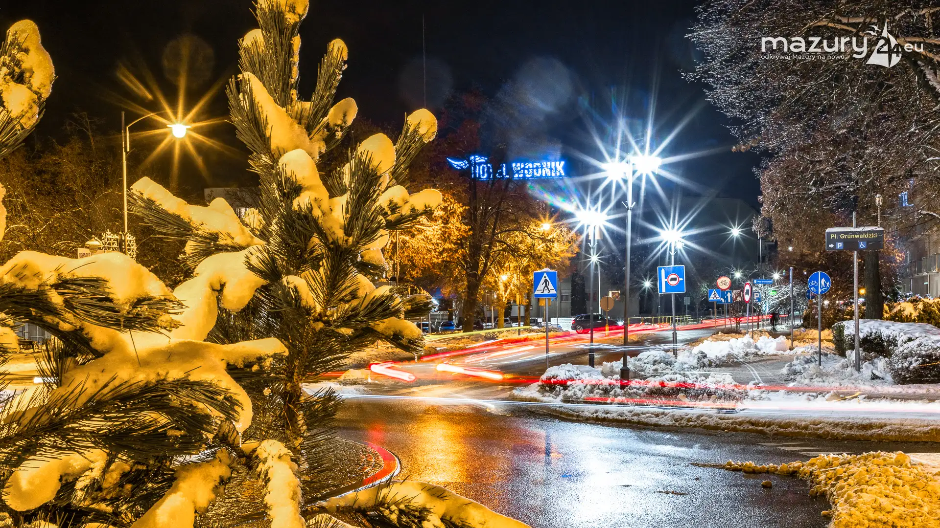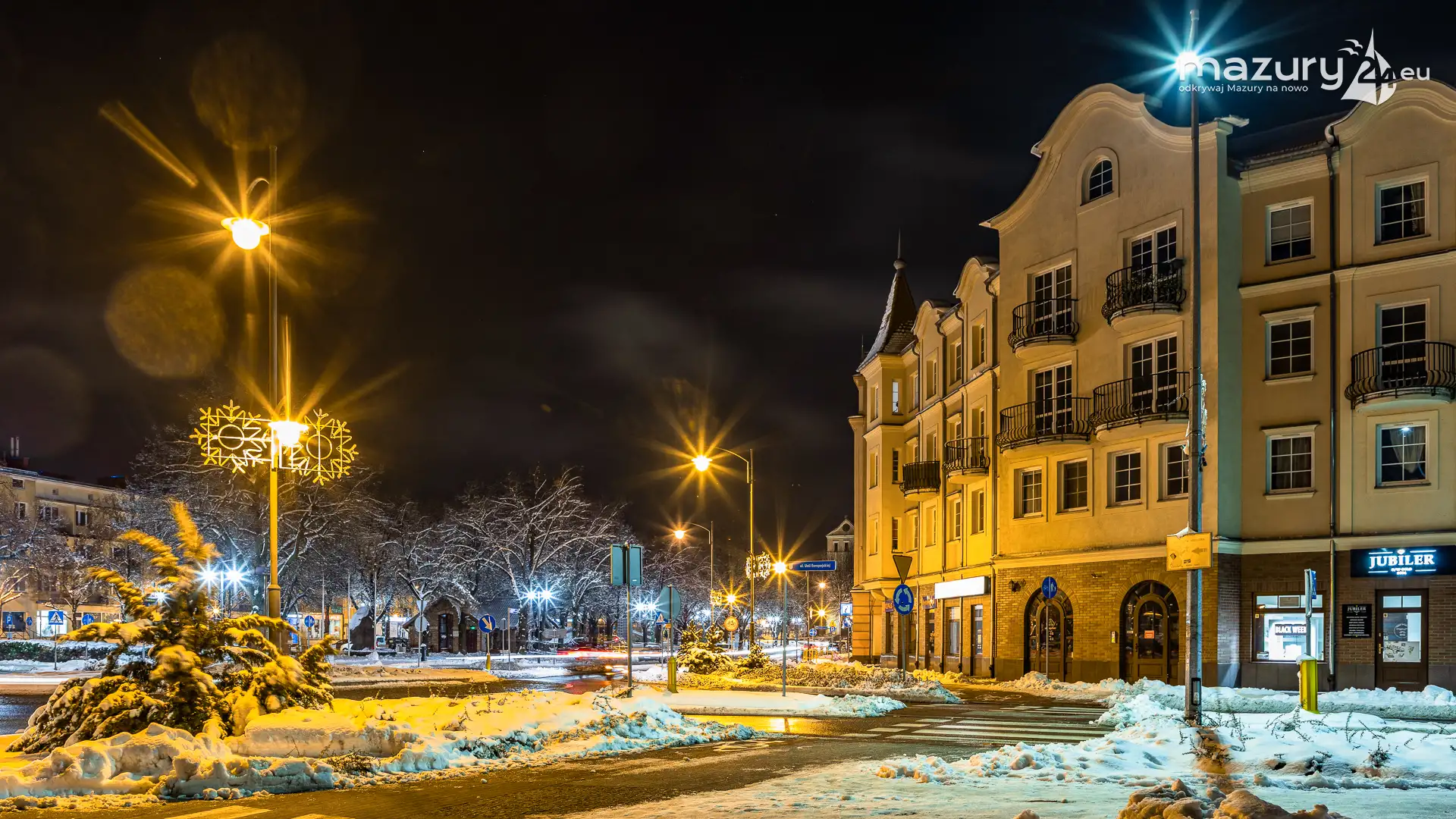 Kilka dni temu, Mazury w ciągu jednej nocy przeszły z trybu jesiennego na zimowy. Mimo pięknej wszechobecnej bieli nie możemy doczekać się słońca. Stąd pomysł na poszukanie kolorów nocą. Zapraszamy na krótki, wieczorny spacer po Giżycku...