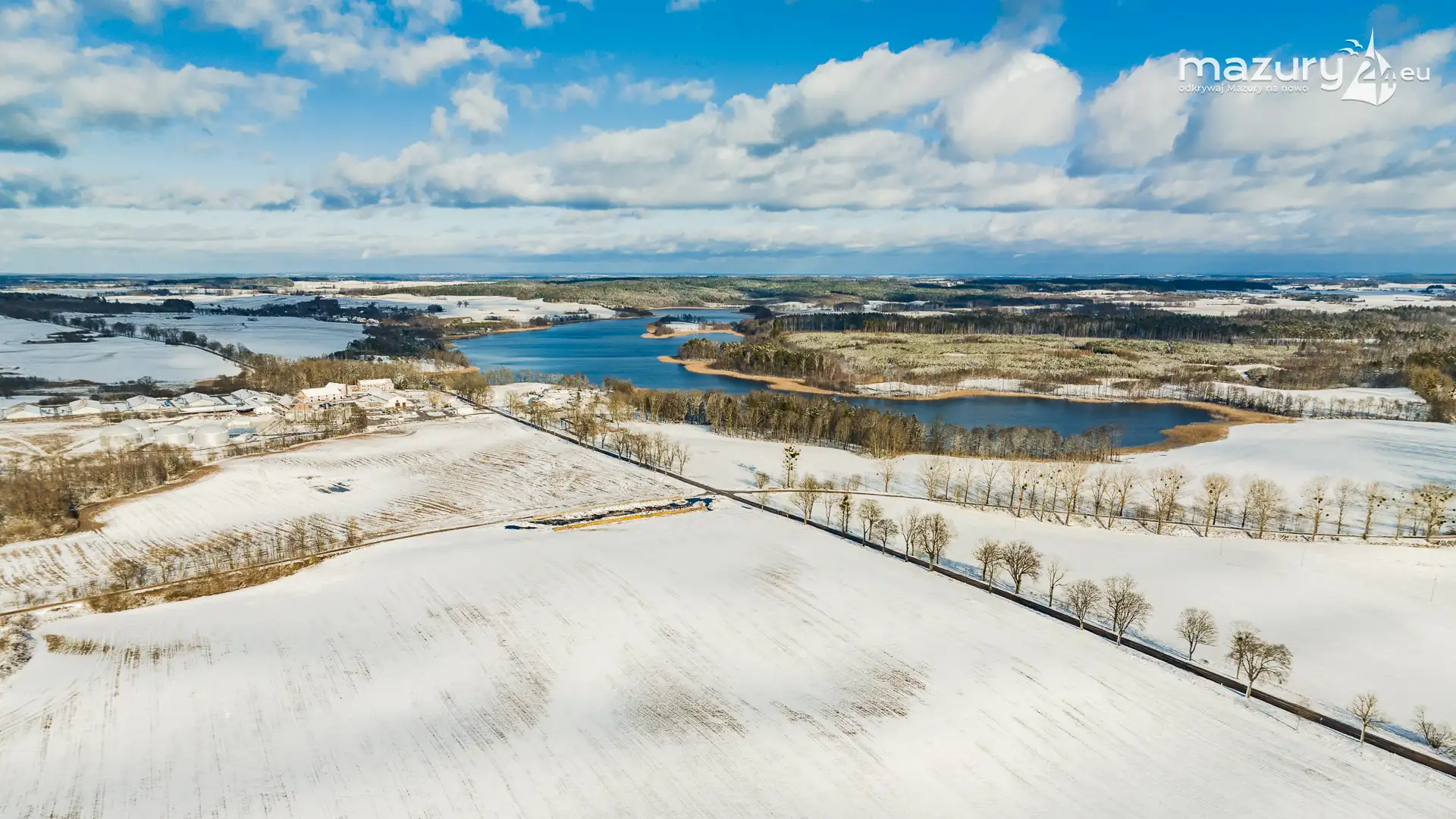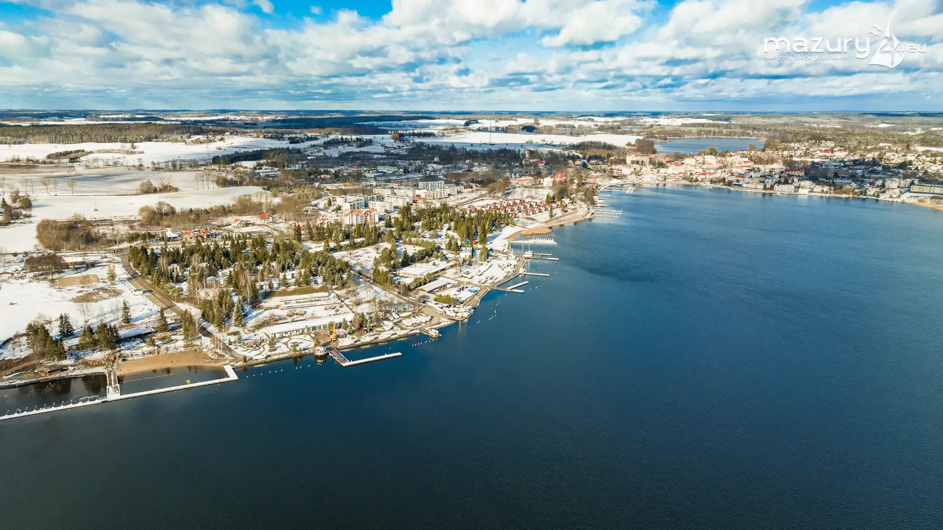 Zimowe Mrągowo, nad jeziorem Czos, okolice amfiteatru z drona